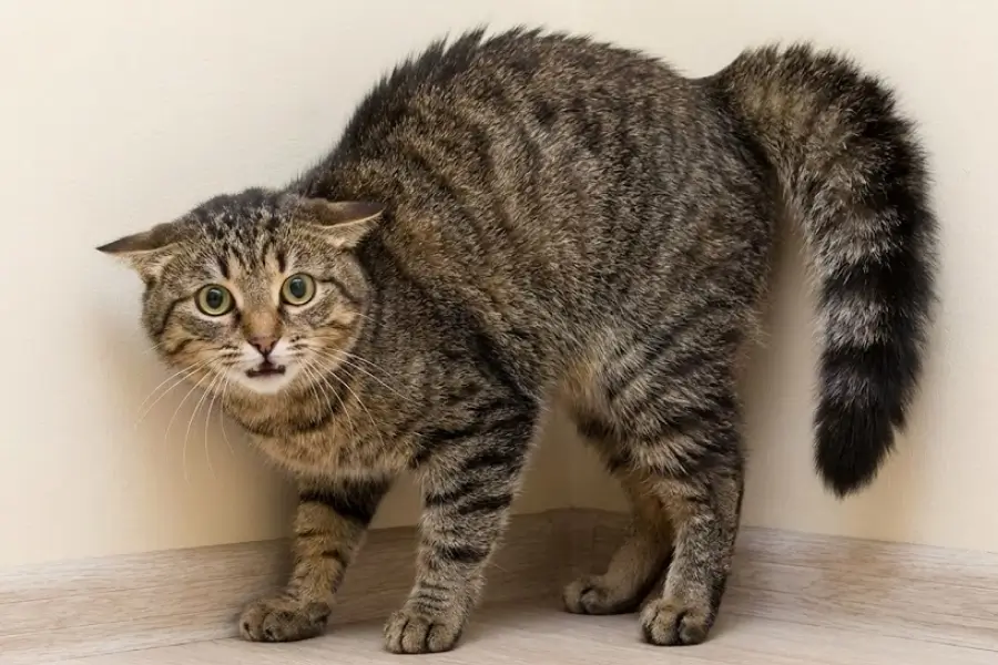 – The Puffball (Bottle Brush): The tail and body fur stand straight up, making the tail look like a bottle brush. This is a clear defense or aggression posture. The cat is trying to look larger and more intimidating to scare away a threat.